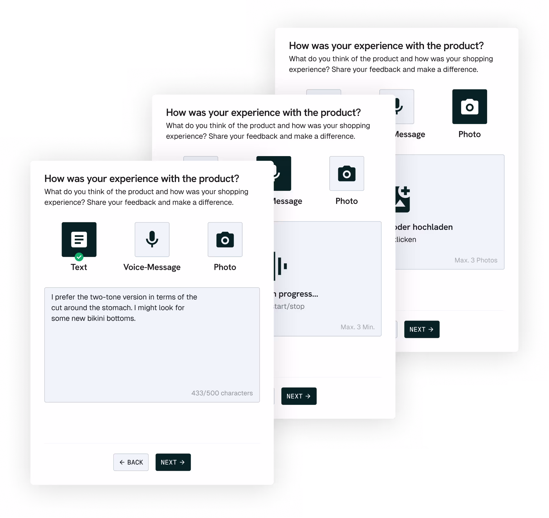 No more puzzling reasons for returns! The intelligent return request collects reasons via text, image and voice message. This gives you clear insights and allows you to optimize in a targeted manner.